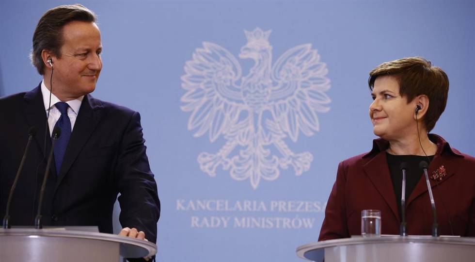 El nuevo Gobierno polaco también sueña con un eje euroescéptico Londres-Varsovia como contrapeso de Berlín y París, que están a favor de la integración. Las relaciones oficiales germanopolacas atraviesan actualmente su peor momento desde la caída del Muro de Berlín en 1989. El problema más espinoso de esta unión conservadora fue, naturalmente, el de las ayudas sociales a los inmigrantes polacos, que Cameron quería recortar durante sus negociaciones con Bruselas.Desde enero, el nuevo Gobierno conservador polaco está jugando a un complejo juego diplomático en torno a la salida de Reino Unido de la UE. Quiere una UE más débil y menos integrada que la actual. Los políticos de Ley y Justicia (PiS) se muestran abiertamente contrarios a un “superestado europeo”. Pero siguen queriendo que tanto Polonia como Reino Unido permanezcan en la UE, principalmente por la seguridad nacional, pero también por los beneficios económicos. A Varsovia le encantaría mantener el interminable flujo de euros que llega a la economía polaca desde Bruselas, y la salida de Reino Unido probablemente haría que este se redujese.